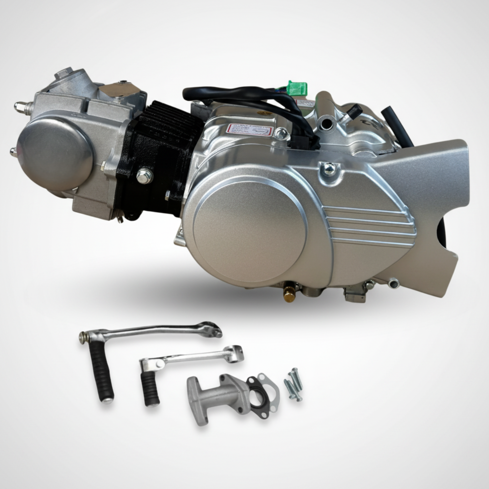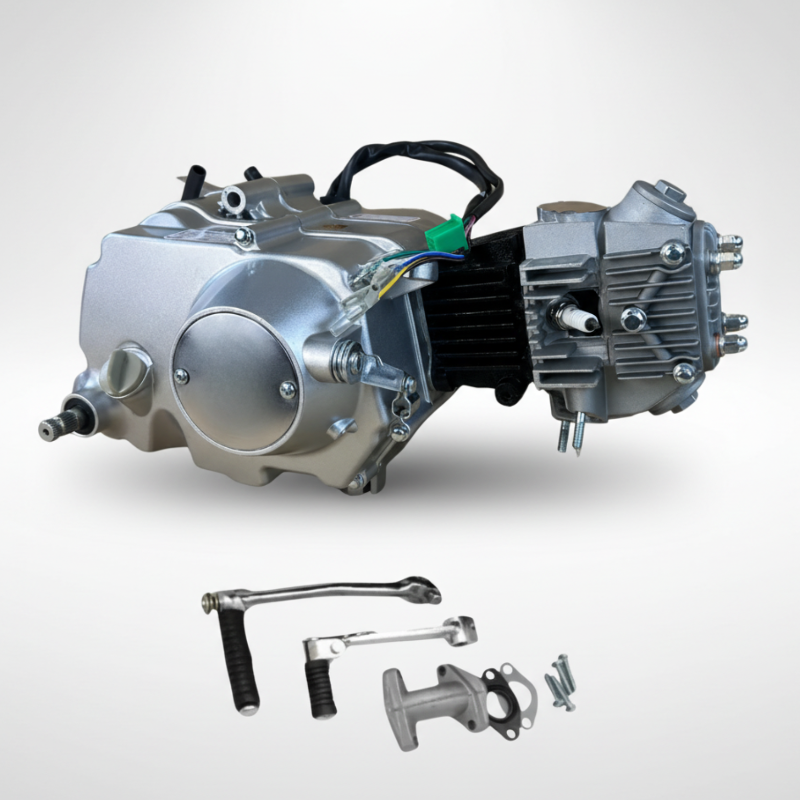 Inclusief bougie, spruitstuk, kickstartpedaal, schakelpedaal en voortandwiel.