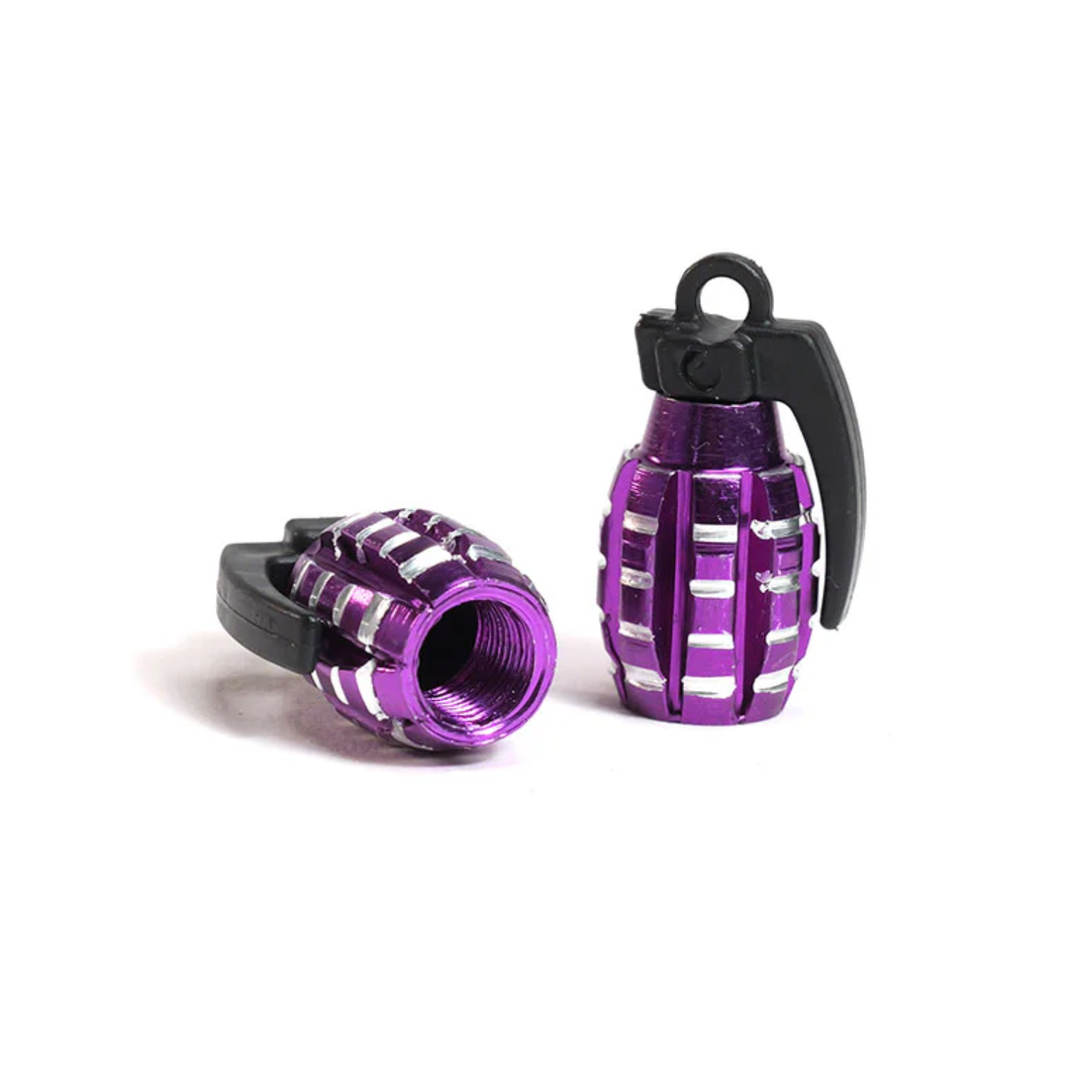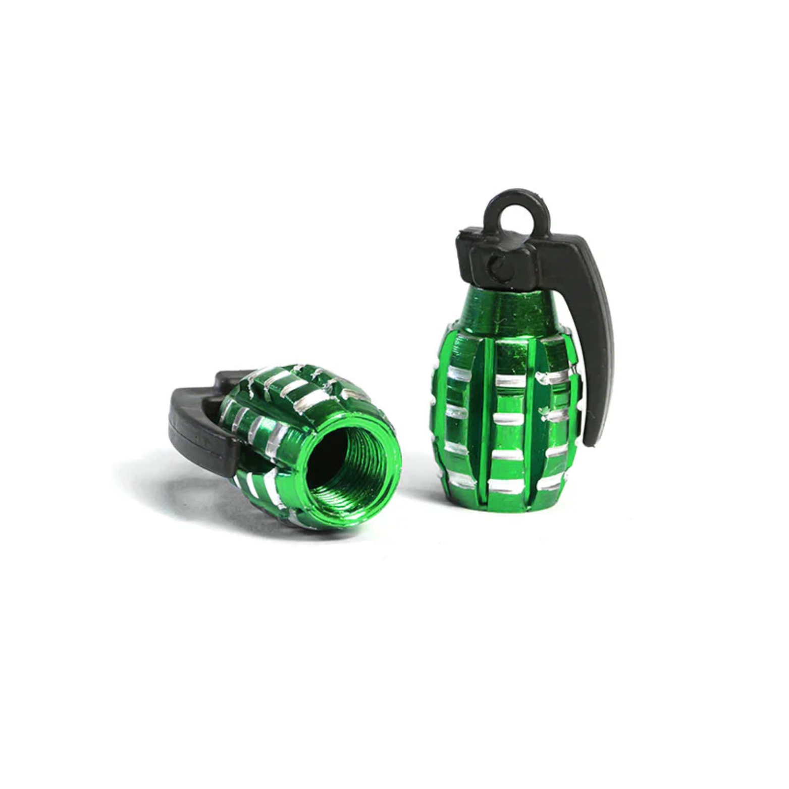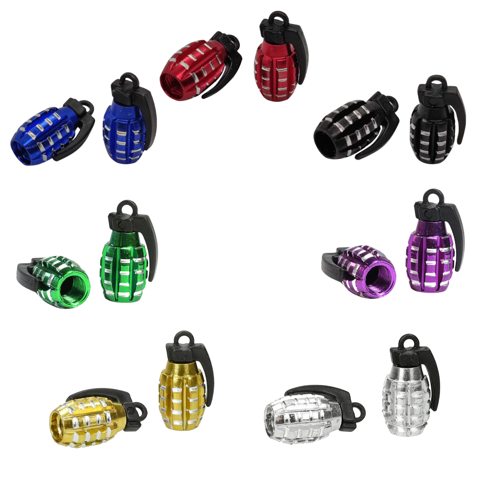 Geef je voertuig een stoere look met deze granaatvormige ventieldopjes. De dopjes zijn gemaakt van licht en duurzaam aluminium en passen op alle standaard Schrader-ventielen (zoals gebruikt bij auto’s, motoren, scooters en fietsen).