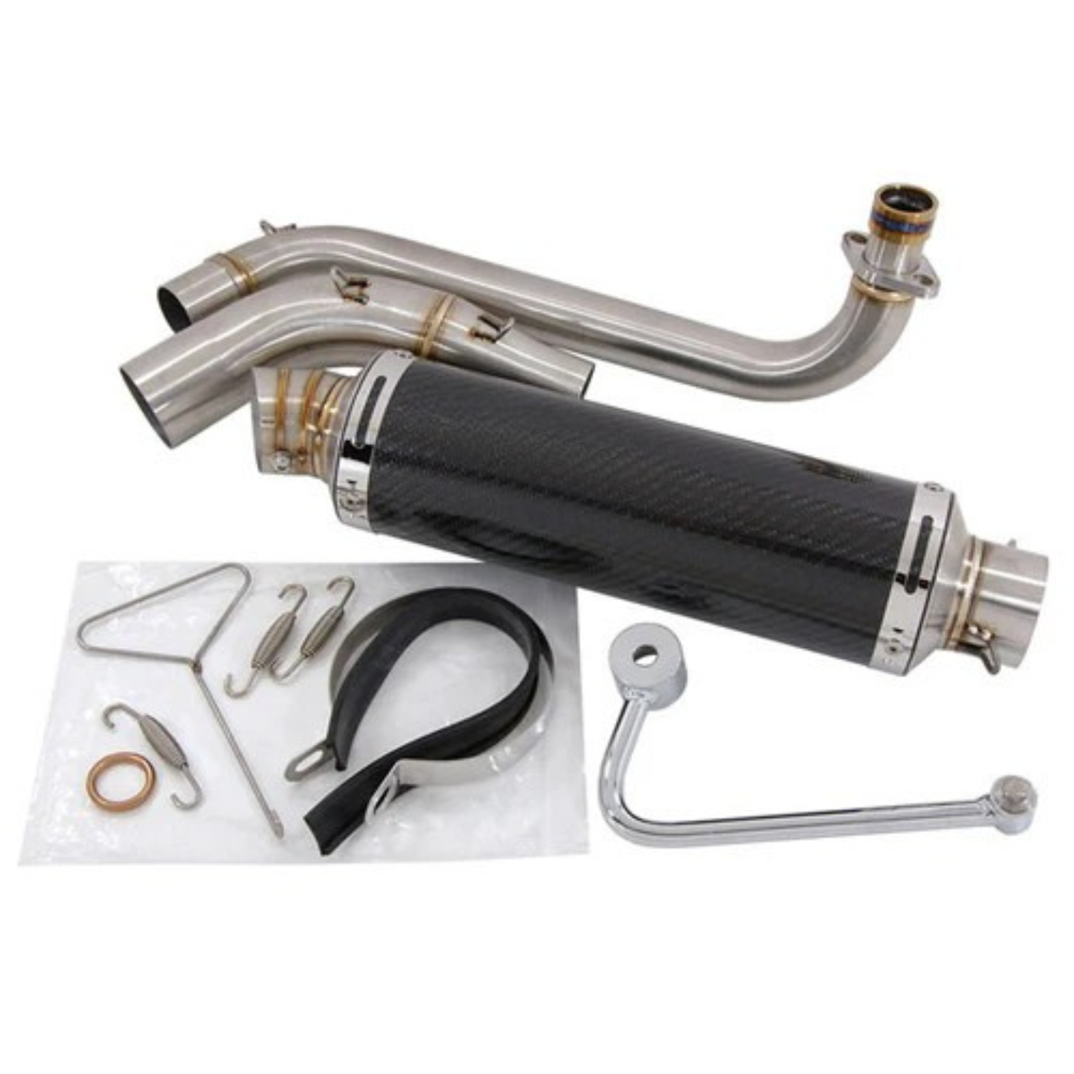 Carbon dubbele uitlaat RVS. 'The shotgun' Twee carbon einddempers boven elkaar - vandaar de naam 'The Shotgun' Compleet geleverd met alle montagemateriaal voor eenvoudige installatie Uitlaat kan zo gemonteerd worden (plug and play) Snelle levering: 1-2 werkdagen Sound: Deze uitlaat heeft een mooi geluid...