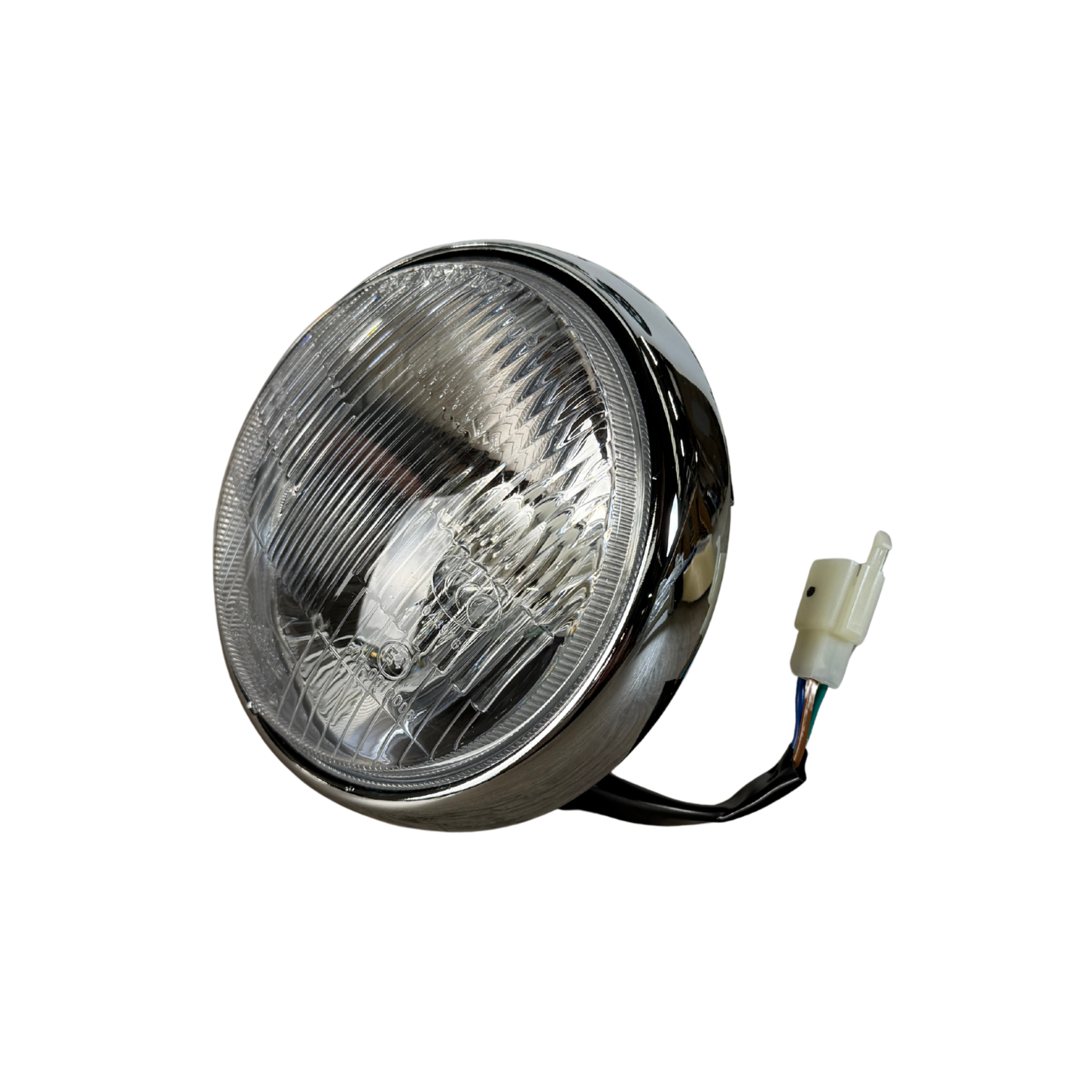 Origineel type koplampinbouw geschikt voor Honda Monkey Z50J, Gorilla en Singa Skymini. Geleverd als complete optiek, bestaande uit lichtring, lens, fitting (socket) en 12V lamp.