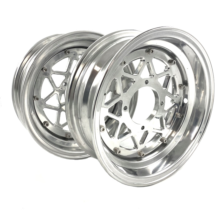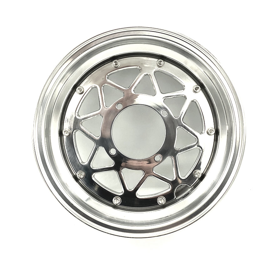 Set van twee tubeless sterrenvelgen in polished aluminium. Deze velgen combineren een moderne uitstraling met stevige constructie en zijn geschikt voor diverse mini 4-takt modellen.