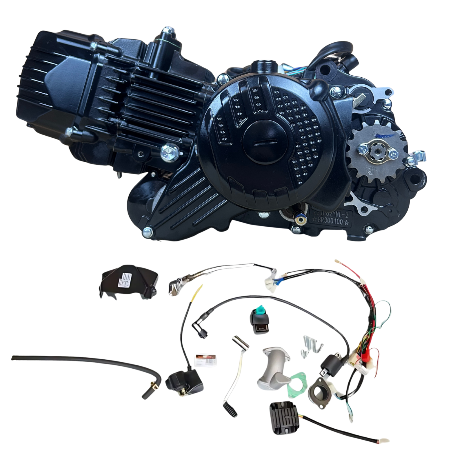 Complete Lifan 50cc Motorblok Zwart met Toebehoren Dit hoogwaardige motorblok wordt geleverd met een kickstart, schakelpedaal en spruitstuk, zodat u deze onderdelen niet apart hoeft aan te schaffen. De motor is handgeschakeld (handkoppeling) en beschikt over vier versnellingen met het volgende schakelpatroon: 1N234. LET...